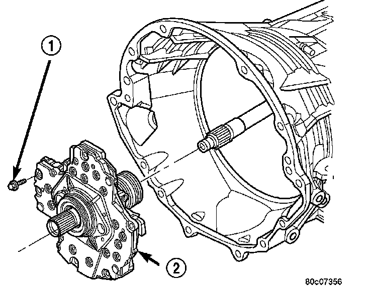 43. Install the bolts (1) to hold the oil pump into the transmission case. Tighten the oil pump bolts to 28 Nm (250 inch lbs.).