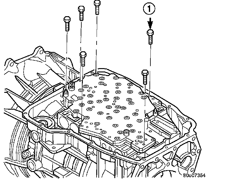 49. Install the valve body. Verify that the pin on the manual lever has properly engaged the TRS selector plate. Tighten the valve body to transmission case bolts (1) to 12 Nm (105 inch lbs.).