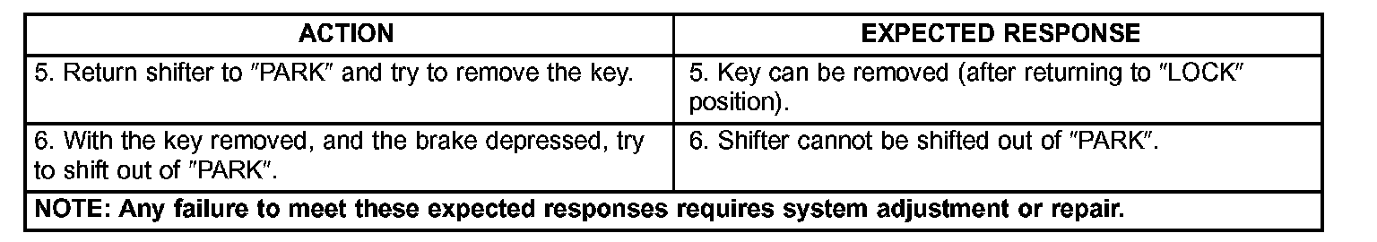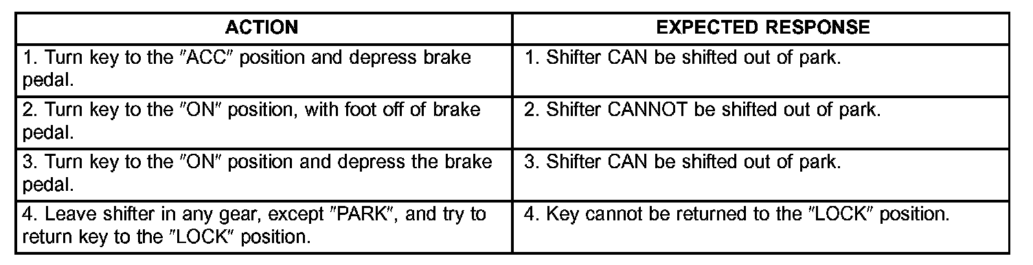 The chart describes the normal operation of the Brake Transmission Shift Interlock (BTSI) system. If the "expected response" differs from the vehicle's response, then system repair and/or adjustment is necessary.