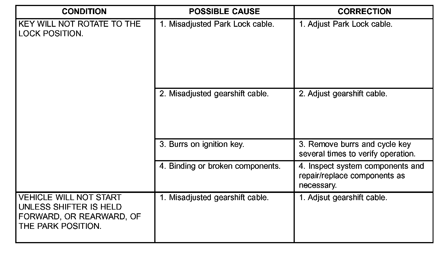 2. When the shift lever is in PARK, the ignition key cylinder should rotate freely from ACC to LOCK. When the shifter is in any other gear or neutral position, the ignition key cylinder should not rotate to the LOCK position.
