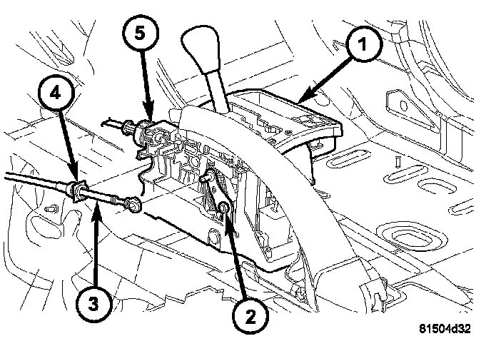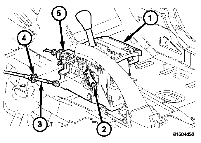 6. Install the park lock cable (5) to the shift mechanism cam and the notch in the shifter assembly.