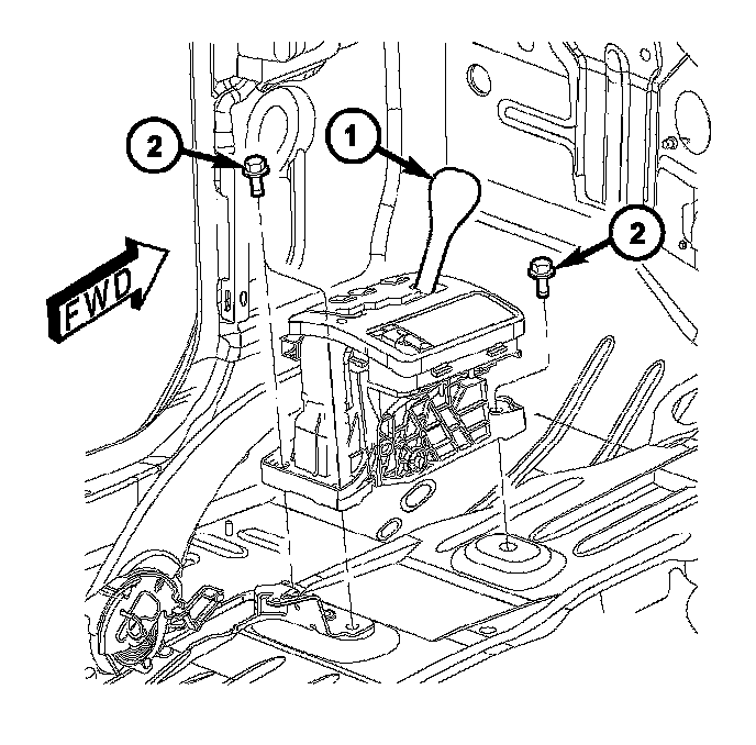 2. Install the bolts (2) to hold the shifter assembly (1) onto the floor pan. Tighten bolts to 12 Nm (105 inch lbs.).