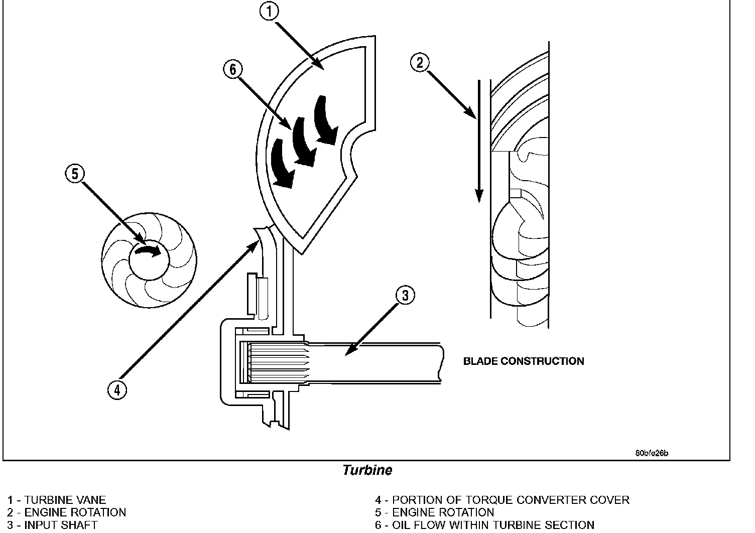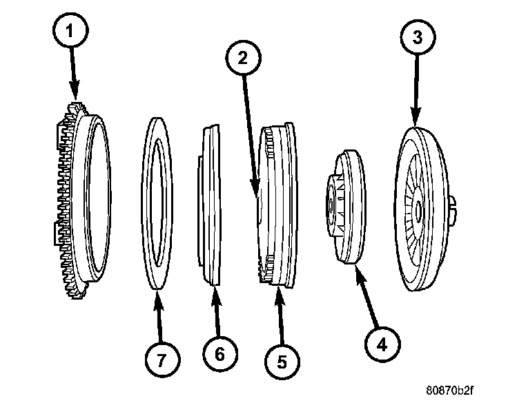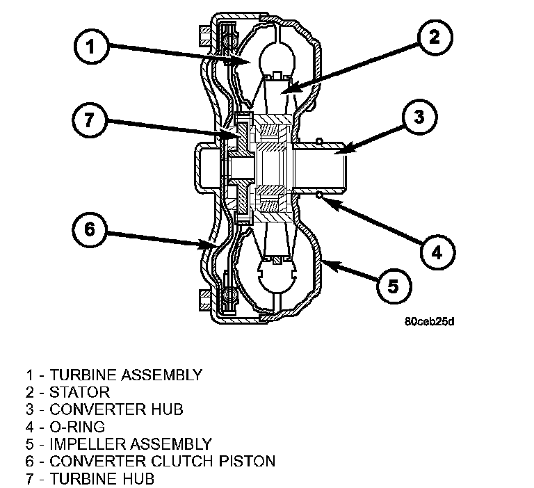 The torque converter is a hydraulic device that couples the engine crankshaft to the transmission. The torque converter consists of an outer shell with an internal turbine (1), a stator (2), an overrunning clutch, an impeller (5), and an electronically applied converter clutch (6). The converter clutch provides reduced engine speed and greater fuel economy when engaged. Clutch engagement also provides reduced transmission fluid temperatures. The torque converter hub (3) drives the transmission oil (fluid) pump and contains an O-ring seal (4) to better control oil flow.