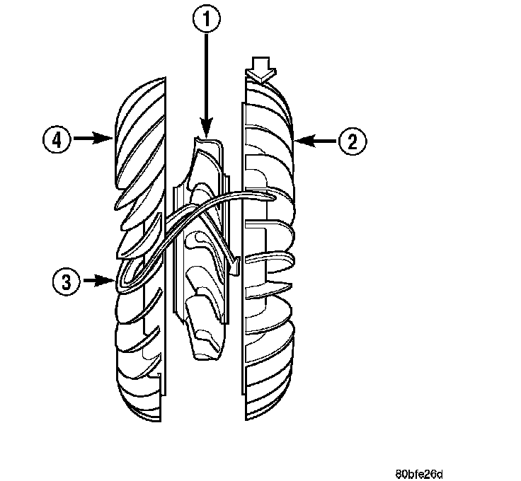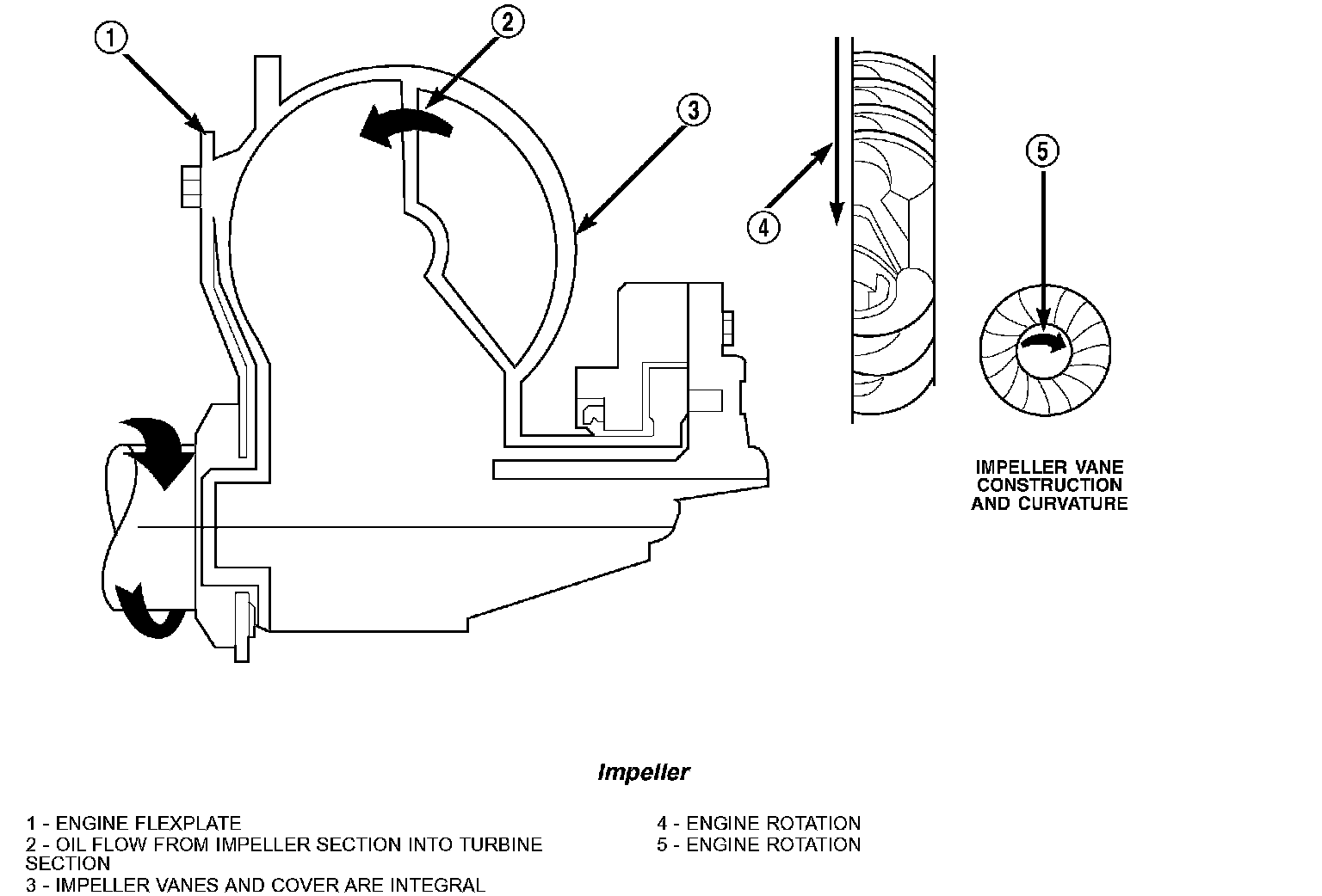 The impeller is an integral part of the converter housing. The impeller consists of curved blades placed radially along the inside of the housing on the transmission side of the converter. As the converter housing is rotated by the engine, so is the impeller, because they are one and the same and are the driving members of the system.