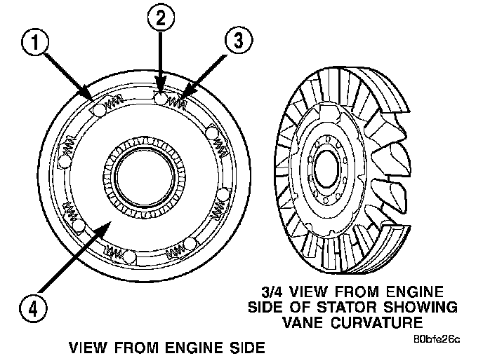 The stator contains an over-running clutch (1-4), which allows the stator to rotate only in a clockwise direction. When the stator is locked against the over-running clutch, the torque multiplication feature of the torque converter is operational.