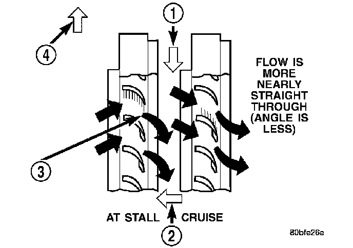 Torque multiplication is achieved by locking the stator's over-running clutch to its shaft. Under stall conditions (the turbine is stationary), the oil leaving the turbine blades strikes the face of the stator blades and tries to rotate them in a counterclockwise direction. When this happens the over-running clutch of the stator locks and holds the stator from rotating. With the stator locked, the oil strikes the stator blades and is redirected into a "helping" direction before it enters the impeller. This circulation of oil from impeller to turbine, turbine to stator, and stator to impeller, can produce a maximum torque multiplication of about 2.4:1. As the turbine begins to match the speed of the impeller, the fluid that was hitting the stator in such as way as to cause it to lock-up is no longer doing so. In this condition of operation, the stator begins to free wheel and the converter acts as a fluid coupling.