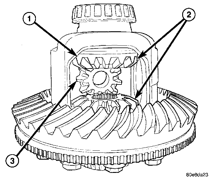 3. Install first pinion gear (3) with thrust washer into differential window (1) and side gears (2). Rotate pinion gear into the case.