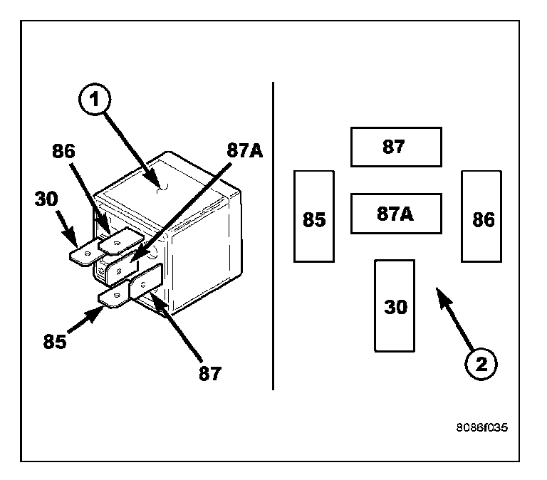 - Terminal (86) receives fused battery current through the run relay only when the run relay coil is energized.
