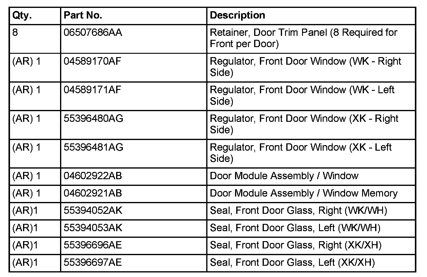 If the regulator is replaced, the door module may need to be replaced. If the vehicle was built prior to 2113107 (WK/XK) or 3115107 (WH), 3113107 (XH) the door module will need to be replaced in addition to the window regulator. If the vehicle was built after the appropriate date, you do not need to replace the door module.