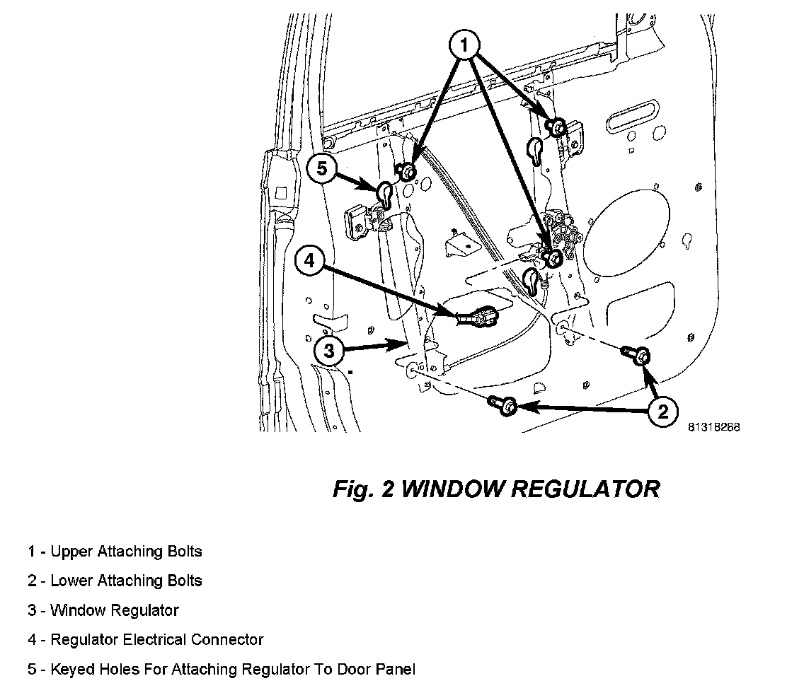 7. Verify that the window regulator assembly is properly attached to the inner door panel. Tighten the five (5) attaching bolts to 8.8 N-m (75 in. lbs) (Fig. 2).