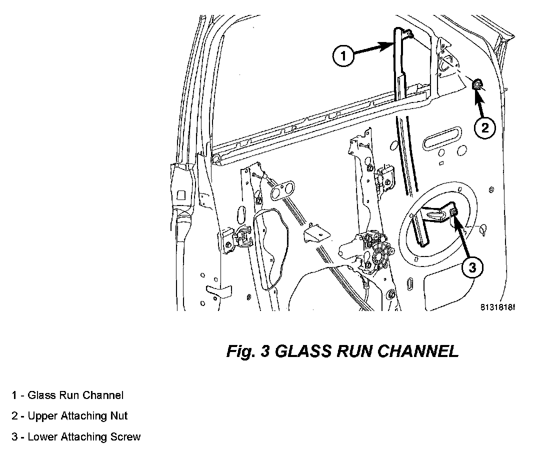 8. Verify that the window glass run channel is properly attached to the inner door panel. Tighten the upper nut and the lower screw to 10 N-m (90 in. lbs) (Fig. 3).