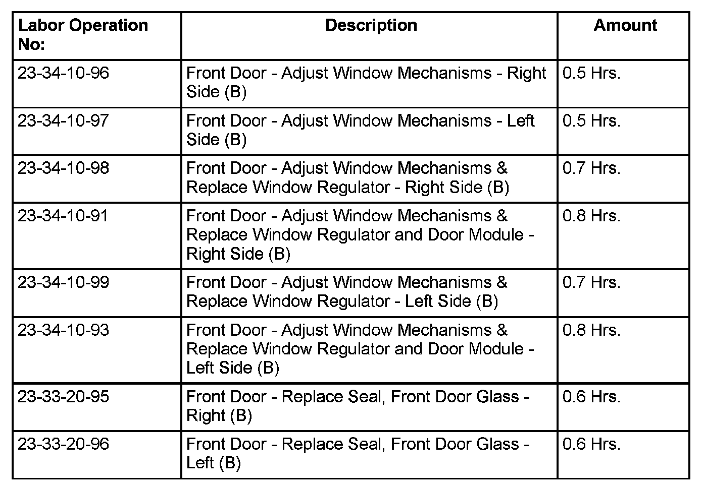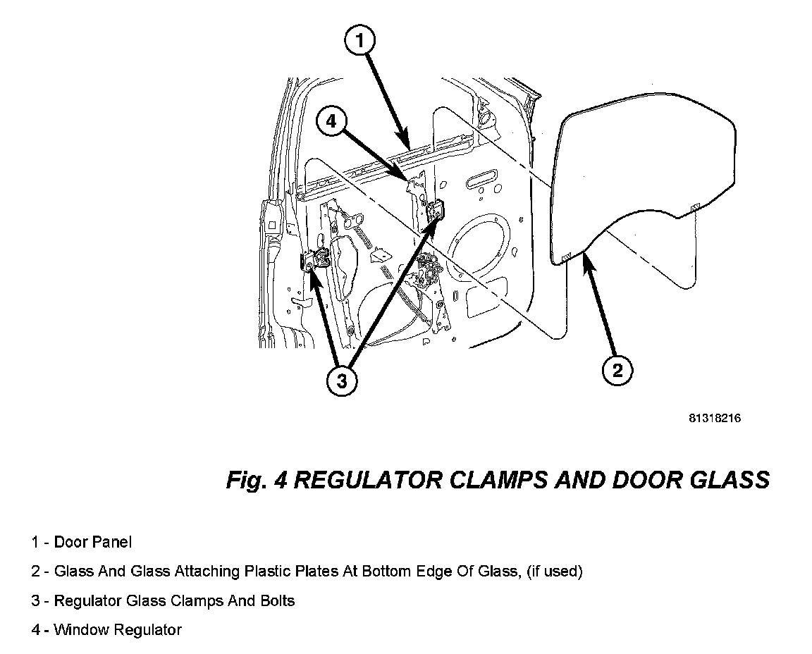 ^ Door glass sticks, tracks poorly, pivots, or falls down inside door. This condition may be due to the glass not being installed correctly to the window regulator clamps.