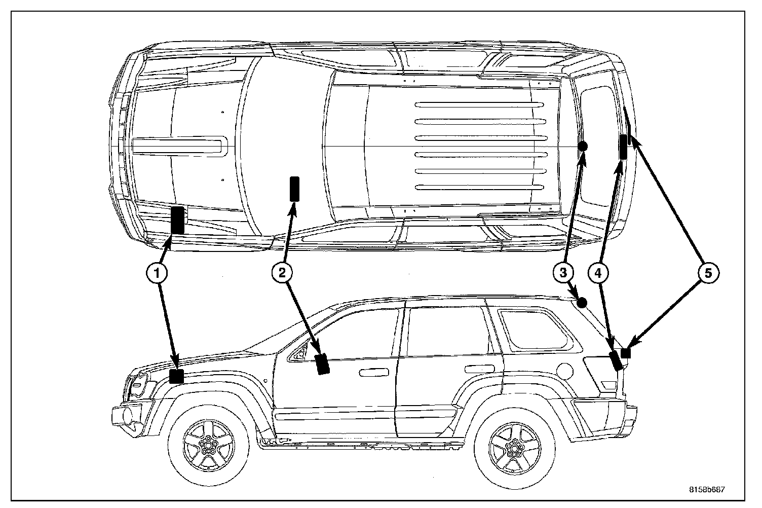 - Rear Wiper Module (4) - The rear wiper module includes the module bracket, two rubber-isolated wiper module mounts and the rear wiper motor. The wiper motor output shaft is the only visible component of the rear wiper module. The remainder of the module is concealed within the liftgate beneath the liftgate glass opening.