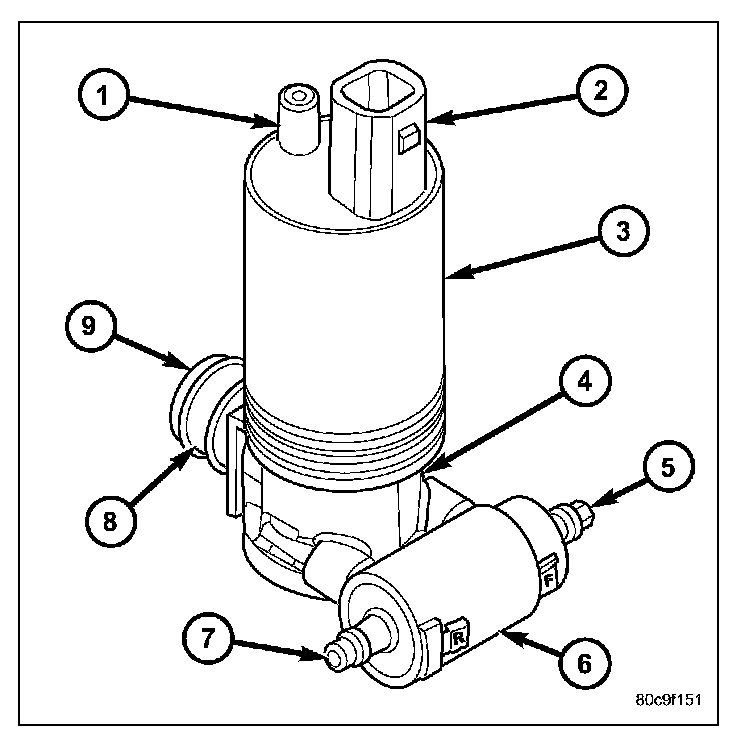 The washer pump/motor unit features a reversible electric motor. The direction of the motor is controlled by hard wired outputs from the Front Control Module (FCM). When battery current and ground are applied to the two pump motor terminals, the motor rotates in one direction. When the polarity of these connections is reversed, the motor rotates in the opposite direction. When the pump motor is energized, the rotor-type pump pressurizes the washer fluid and forces it through one of the two pump outlet nipples, and into the front or rear washer plumbing.