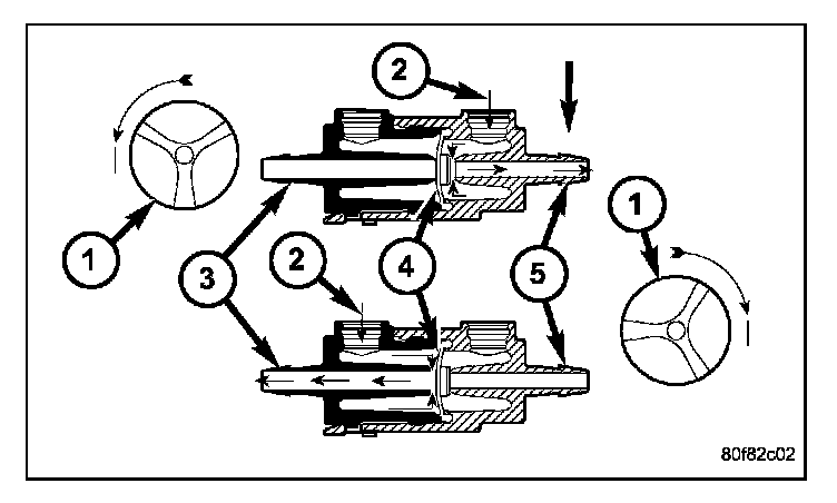 When the pump impeller (1) rotates in the counterclockwise direction (viewed from the bottom), the biased diaphragm is sealing off the rear washer system outlet and nipple so the pressurized washer fluid is pushed out through the pump front outlet port and the front washer outlet nipple (5). When the pump impeller rotates in the clockwise direction (viewed from the bottom), pressurized washer fluid is pushed out through the pump rear outlet port and moves the diaphragm to open the rear washer outlet nipple and seal off the front washer outlet nipple, then the pressurized washer fluid is pushed out through the rear washer outlet nipple (3).
