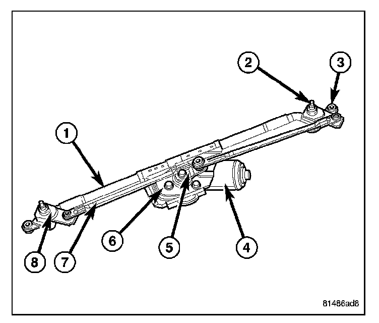 - Linkage - Two stamped steel drive links (7) connect the wiper motor crank arm to the wiper pivot lever arms (8). The right side drive link has a plastic socket-type bushing on each end. The left side drive link has a plastic socket-type bushing on one end, and a plastic sleeve-type bushing on the other end. The socket-type bushing on one end of each drive link is snap-fit over the ball stud on the lever arm of its respective pivot. The left side drive link sleeve-type bushing end is then fit over the motor crank arm ball stud, and the other socket type bushing of the right side drive link is snap-fit over the exposed end of the wiper motor crank arm ball stud.