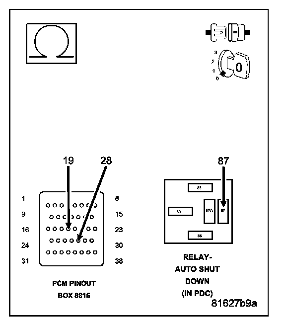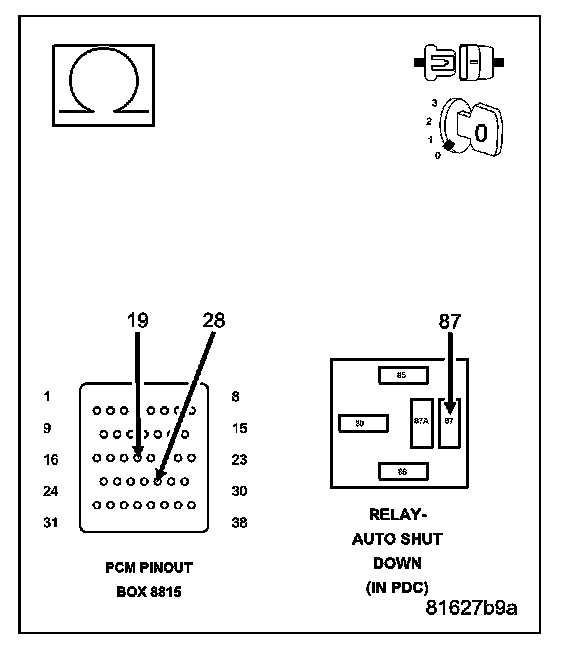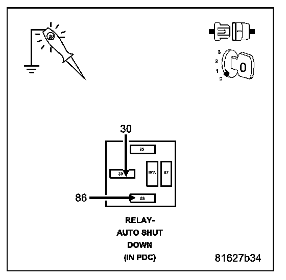 NOTE: Diagnose P0685 - Auto Shutdown Relay Control Circuit first if it set along with this DTC.