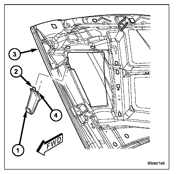 2. Using a trim stick or another suitable wide flatbladed tool, pry the rearward end of the hood ajar switch striker (1) away from the inner hood panel reinforcement far enough to disengage the integral retainer (4) from its mounting hole.