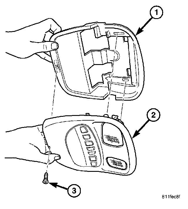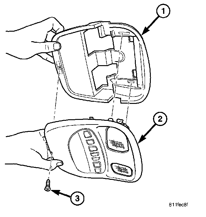 2. Remove the overhead console retaining screw (3), located in the front of console (2) near the windshield.