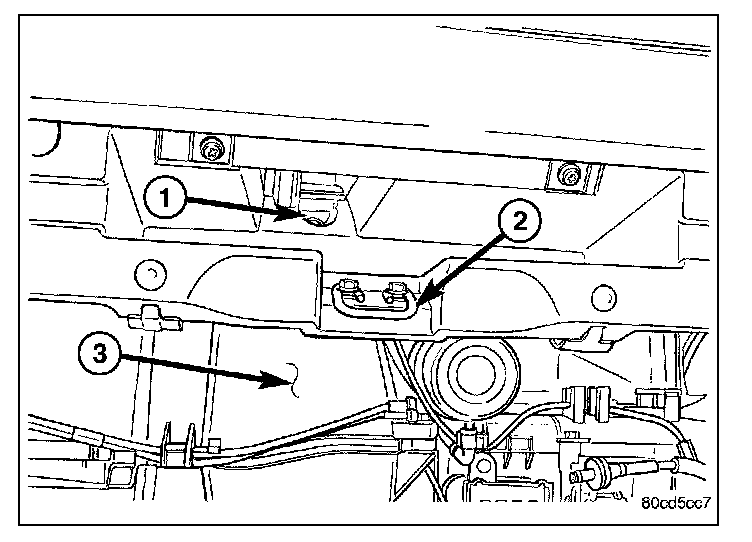 19. Install the two bolts (2) at the front of the pedal support bracket.