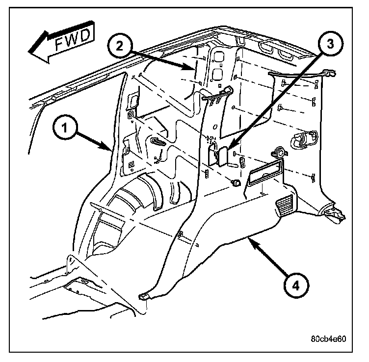 1. Using a trim stick C-4755 or equivalent, remove the rear header trim.