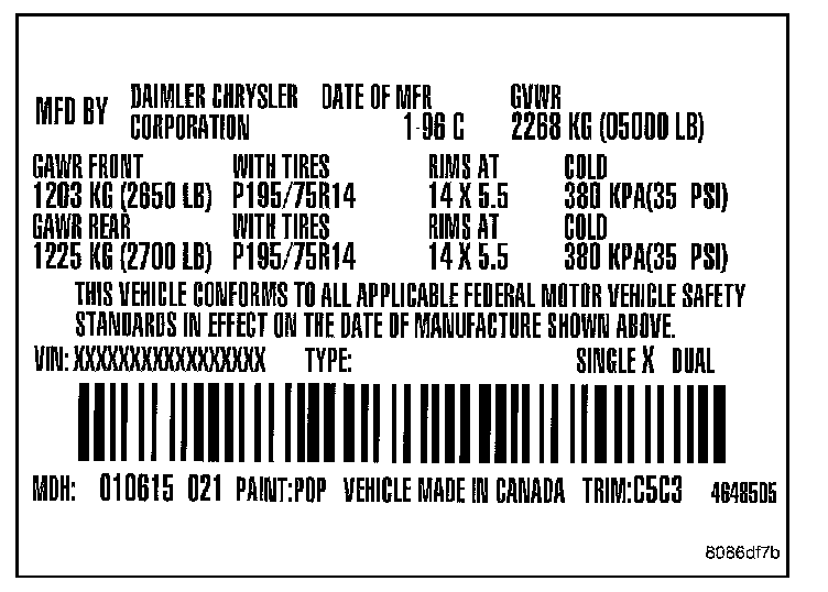 A vehicle certification label is attached to every DaimlerChrysler Corporation vehicle. The label certifies that the vehicle conforms to all applicable Federal Motor Vehicle Standards. The label also lists: