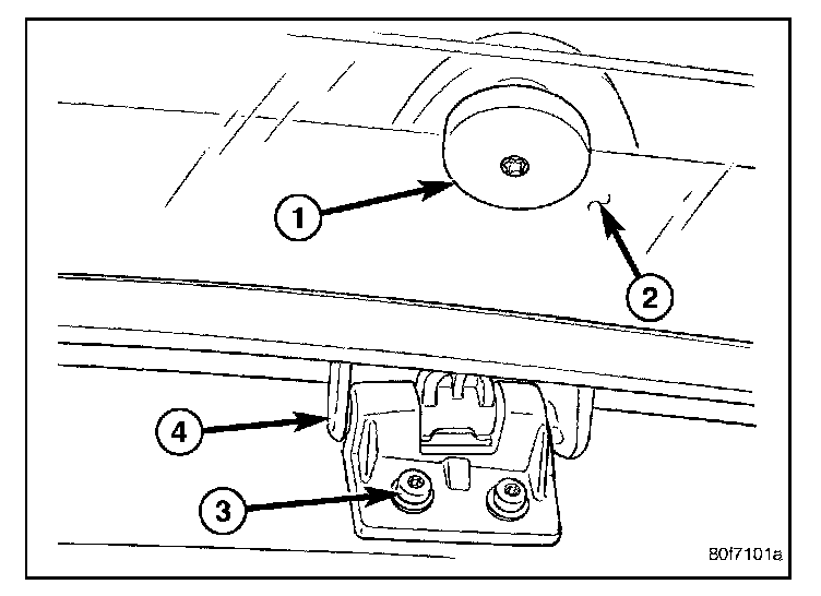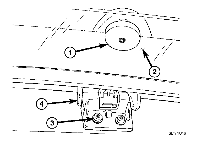 4. Remove the bolts (1 and 3) and remove the hinge (4).
