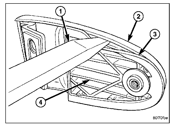 5. Using a trim stick C-4755 (1) or equivalent, release the lower locking tabs (2) and remove the hinge cover.