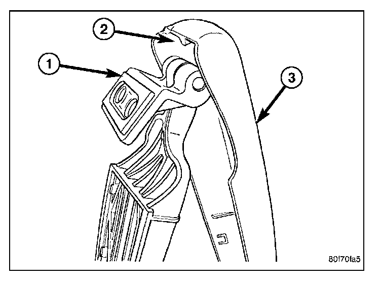 6. Position the top of the hinge cover (3) over the hinge (1) and engage the cover tab (2).