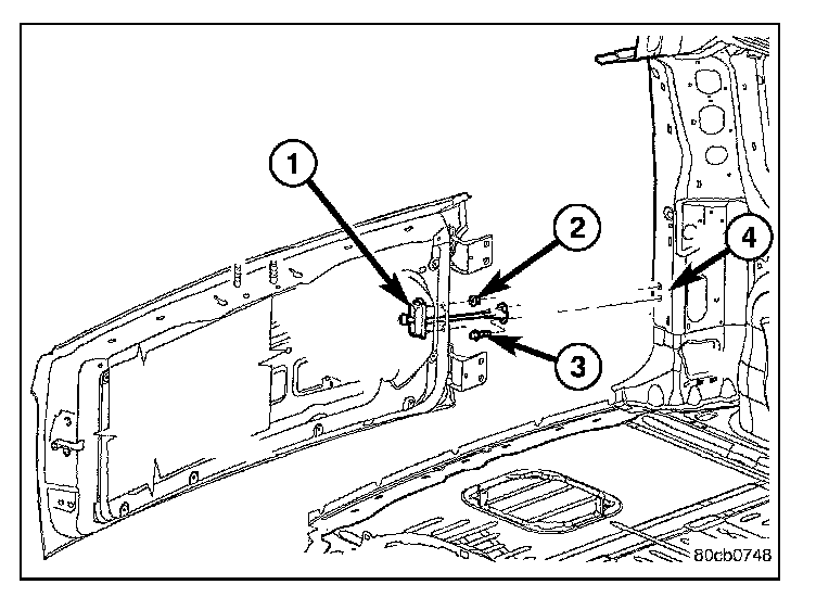 3. Remove the bolts (3) attaching the check strap (1) to the D-pillar (4).