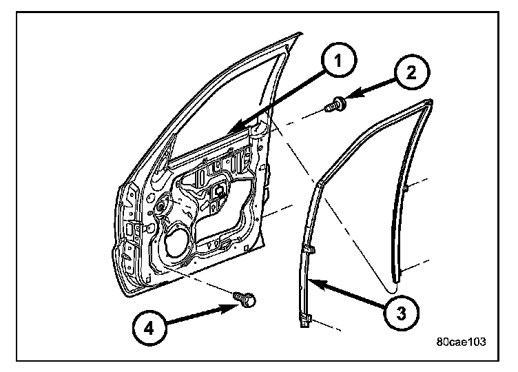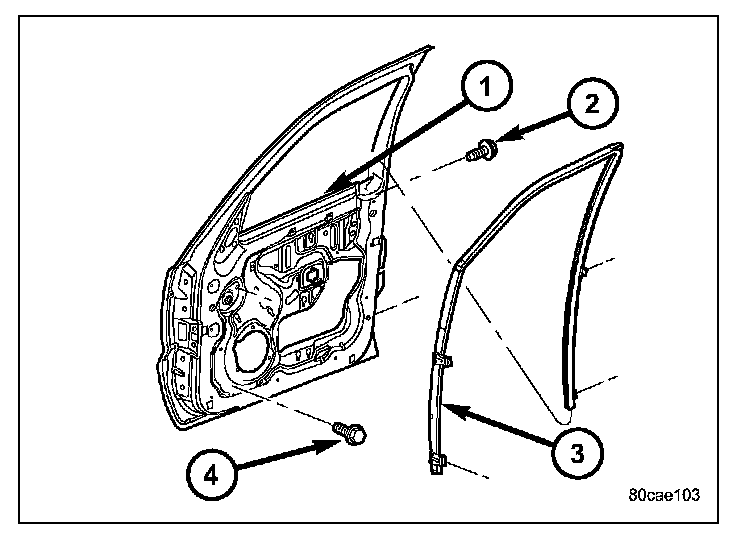 1. Install the run channel (3) through the window opening (1) and into the door frame.