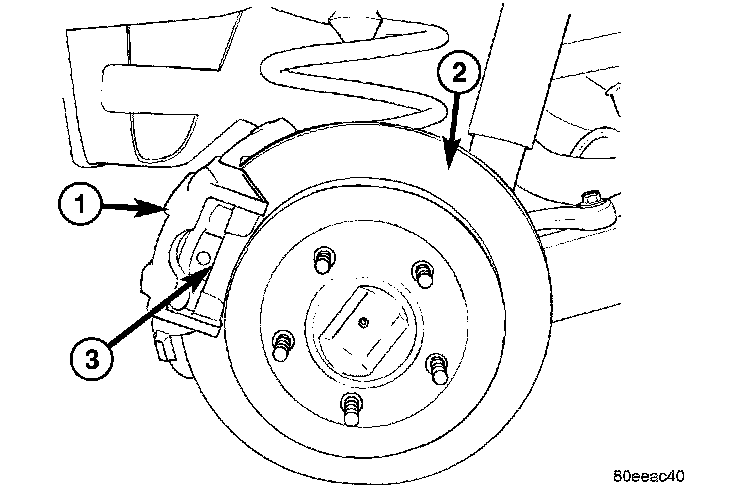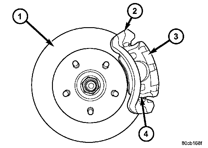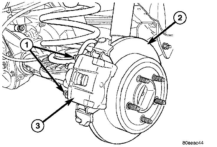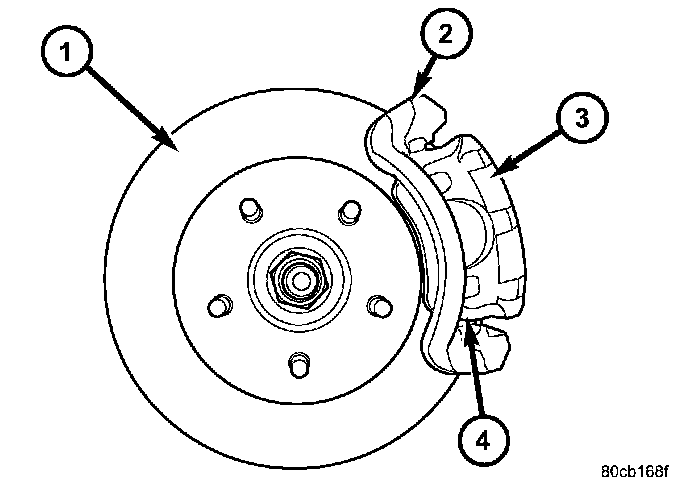 CAUTION: Never allow the disc brake caliper to hang from the brake hose. Damage to the brake hose will result. Provide a suitable support to hang the caliper securely.