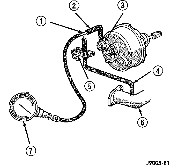 6. If vacuum drops more than one inch Hg (33 millibars) within 15 seconds, booster diaphragm or check valve is faulty.