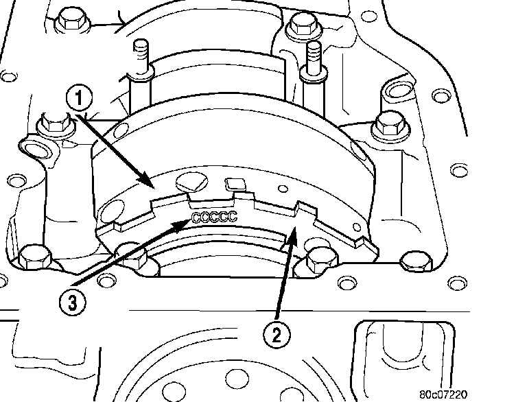 The main bearings are select fit to achieve proper oil clearances. For main bearing selection, the crankshaft position sensor target wheel (2) has grade identification marks stamped into it. These marks are read from left to right, corresponding with journal number 1, 2, 3, 4. The crankshaft position sensor target wheel is mounted to the number 6 counter weight (1) on the crankshaft.