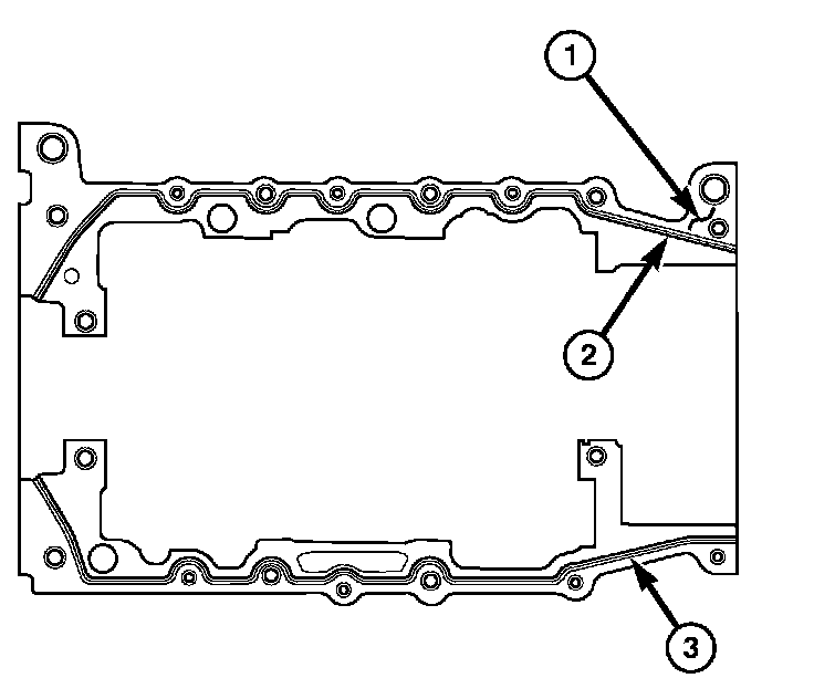 5. Apply a 2.5 mm (0.100 inch) bead of Mopar Engine RTV sealant to the cylinder block-to-bedplate mating surface (2,3) as shown.