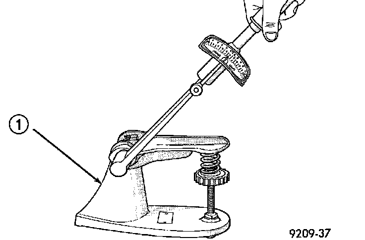 Inspect the valve springs for physical signs of wear or damage. Turn table of tool C-647 (1) until surface is in line with the 40.12 mm (1.579 inch) mark on the threaded stud and the zero mark on the front. Place spring over the stud on the table and lift compressing lever to set tone device. Pull on torque wrench until a Ping is heard. Take reading on torque wrench at this instant. Multiply this reading by two. This will give the spring load at test length. Fractional measurements are indicated on the table for finer adjustments. Refer to Specifications to obtain specified height and allowable tensions. Replace any springs that do not meet specifications.