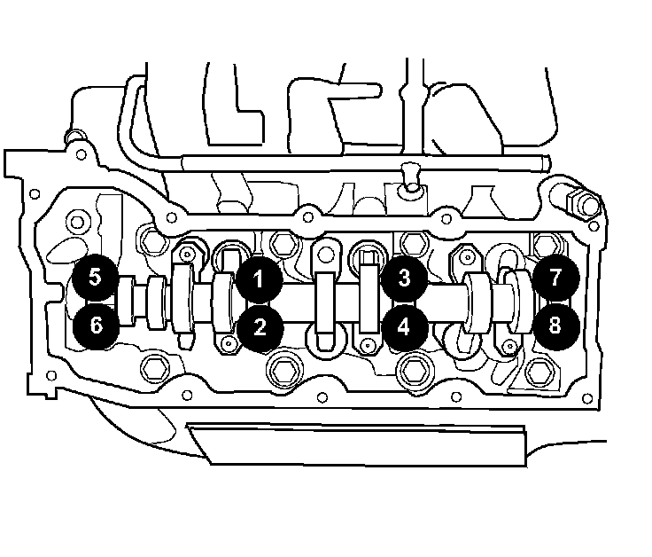 7. Install the camshaft bearing cap retaining bolts. Tighten the bolts 9 - 13 Nm (100 inch lbs.) in 1/2 turn increments in the sequence shown.