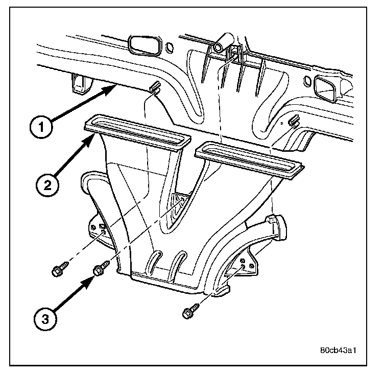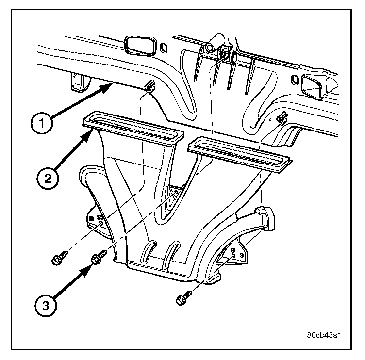 2. Remove the three screws (3) that secure the defroster duct (2) to the instrument panel (1) and remove the duct.