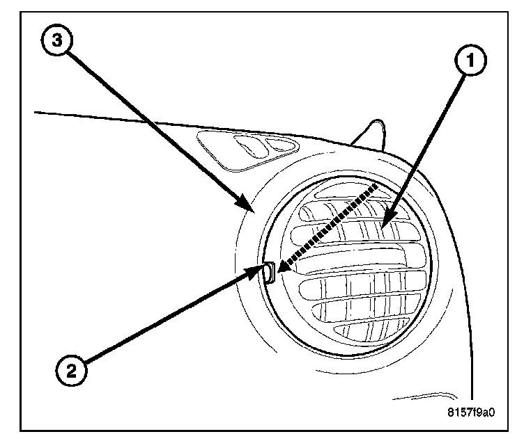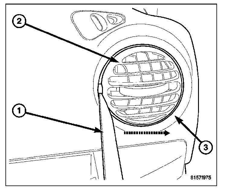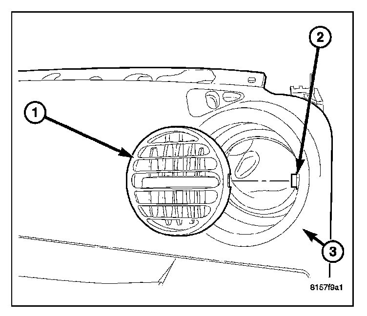 1. Install the air outlet barrel (1) onto the larger pivot shaft (2) located in the instrument panel air outlet housing (3).
