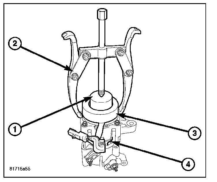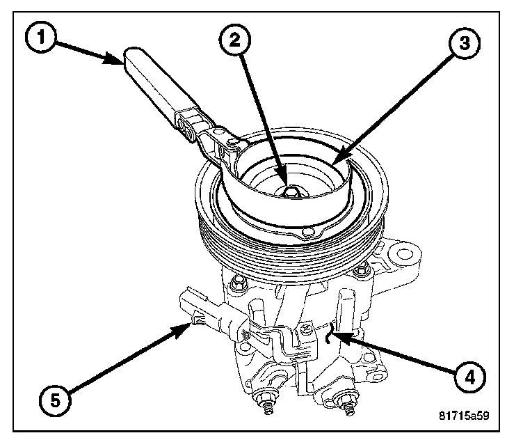 11. Using compressor field coil remover (Special Tool 9354 in Kit 9349) (1) and a two jaw puller (2), remove the clutch field coil (3) from the front of the A/C compressor (4).