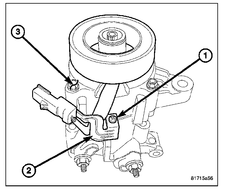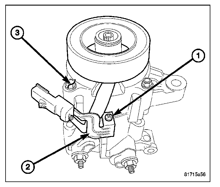 3. Position the clutch field coil wire lead and bracket (2) to the A/C compressor (3) and install the screw (1) that secures the bracket to the compressor. Tighten the screw to 4 N.m (35 in. lbs.).