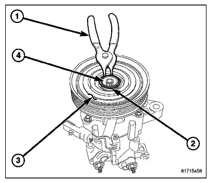6. Using snap ring pliers (1), install the snap ring (2) that secures the pulley and bearing assembly (3) to the front of the A/C compressor (4). Make sure the snap ring is properly seated in the groove.