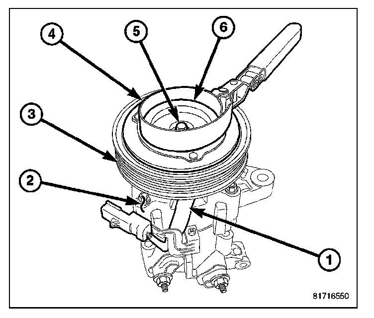 9. Using a strap wrench (4), install the bolt (5) that secures the clutch plate (6) to the A/C compressor. Hold the clutch plate stationary with the strapwrench and tighten the bolt to 15 N.m (133 in. lbs.).