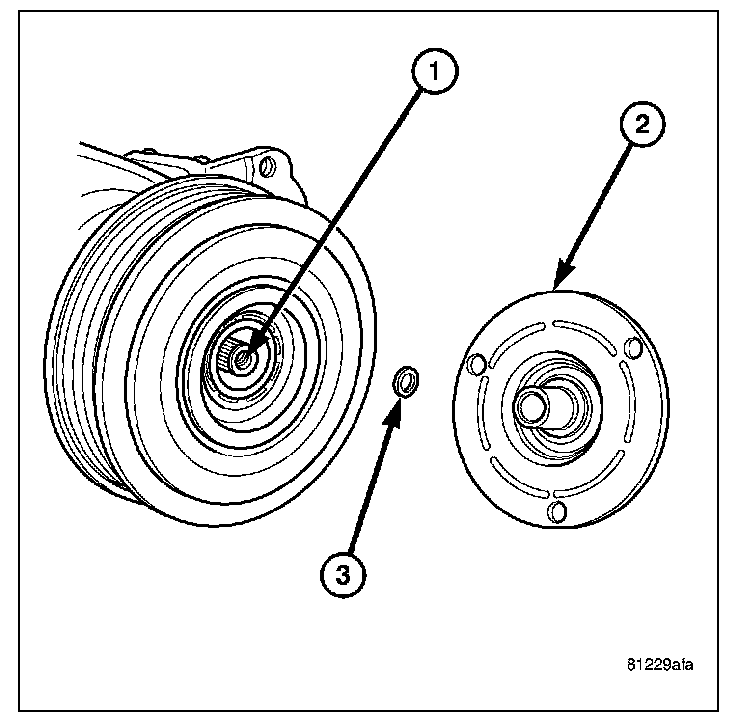 Examine the friction surfaces of the pulley and the clutch plate (2) for wear. The pulley and clutch plate should be replaced if there is excessive wear or scoring.