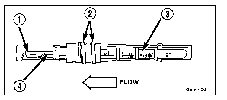 The A/C orifice tube includes a diffuser screen (1), O-ring seals (2) to seal it to the inner wall of the A/C liquid line, an inlet filter screen (3) and the fixed orifice (4).