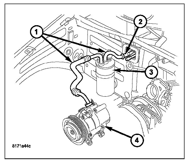 The A/C suction line (1) is the refrigerant line that carries refrigerant from the A/C evaporator (2) to the A/C accumulator (3), and then, to the A/C compressor (4).