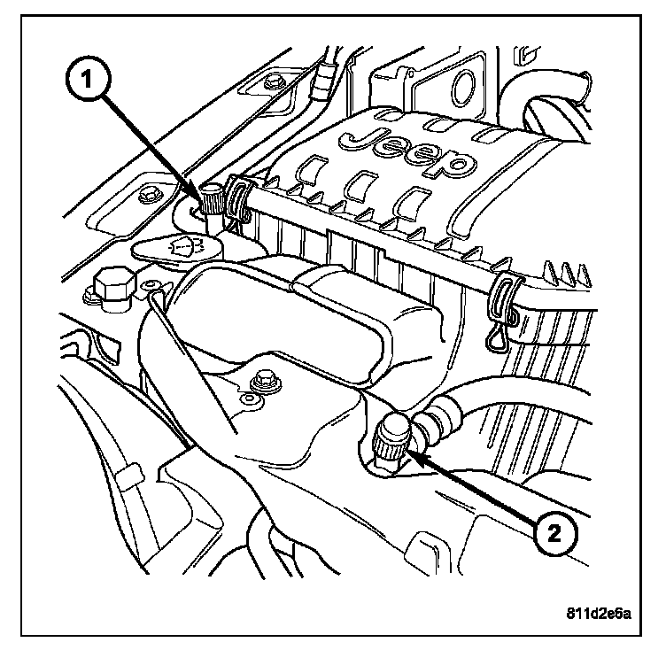 The low-side service port (1) is located on the A/C liquid line near the air filter housing. The high-side service port (2) is located on the A/C discharge line near the A/C condenser. Both the high-side and low-side A/C service port valve cores are serviceable.