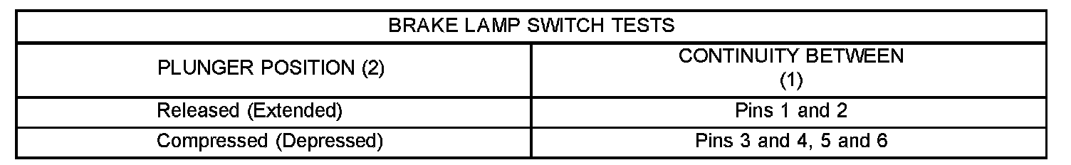3. Using an ohmmeter, perform the continuity tests at the terminal pins (1) in the brake lamp switch connector receptacle as shown in the Brake Lamp Switch Tests table.