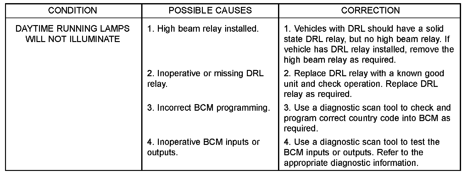 DAYTIME RUNNING LAMPSNOTE: Before performing the following tests, determine whether the headlamp low and high beams operate. If the headlamp high and low beams are also inoperative, diagnose and repair that problem before attempting to repair the Daytime Running Lamps.