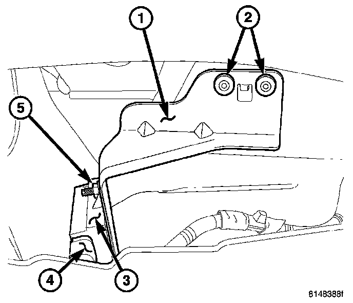 3. Install the transponder/bracket assembly (1) to the vehicle and install new rivets (2).
